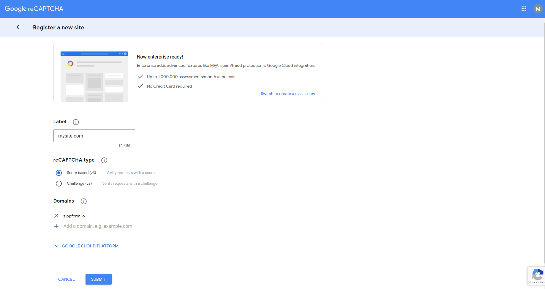 Once submitted, you will be redirected to a screen where you can copy your Google reCAPTCHA Site Key and Secret Key.
